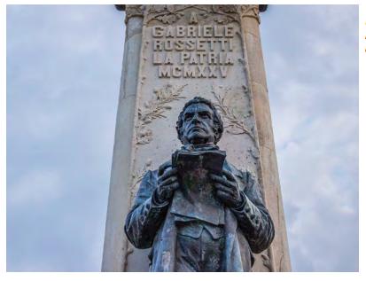 Although Rossetti did not live to see the day that Italy was united, his poetry written over his lifetime inspired other exiles and motivated Italian patriots to continue the fight for freedom against the forces of Spain in the south, France in the central regions, and Austria in the north. In 1901 Rossetti’s sole surviving child William published his father’s Versified Autobiography posthumously in English. In 1910 William arranged to have the autobiography published in Italian under the title La Vita Mia (My Life) by a printer in the city of Lanciano, northwest of Rossetti’s hometown of Vasto. The Italian government honored Rossetti by erecting a large statue of him in the central plaza of Vasto in 1925. In 1987 more than 200 years after his birth, Rossetti’s bones were disinterred from his grave in London and he was returned again to his beloved hometown of Vasto where he was reburied in the same central plaza near to his statue. ❚
