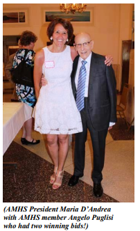 All totaled, the auction raised $4,760 for our Scholarship Endowment Fund. The event took months of hard work and planning by many, but special thanks must be given to Lucio D’Andrea and Dick DiBuono (cochairmen of the event) and AMHS President Maria D’Andrea, who all worked so hard. Lynn Sorbara and her hospitality team (Peter Bell, Margaret Uglow and Albert Paolantonio) ensured that the food (AMHS President Maria D’Andrea with AMHS member Angelo Puglisi who had two winning bids!) was set out in stages throughout the nearly three-hour event.