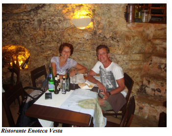 I drove the Fiat and Maria navigated, as usual. This part of Puglia, though, is a bit of a challenge with narrow winding roads, sharp turns, and up and down travel. It passed through beautiful parkland filled with cliffside views of inviting beaches below. But, unfortunately, we were only making time for two stops. The first was Vieste. It is a beautiful town full of alleys, steps, and bright white houses that seem to arise from the water. We walked around for a while and, since it was lunch time, stopped at Ristorante Enoteca Vesta.