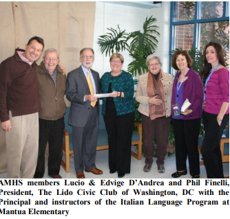 Because of financial constraints, the Lodge was not able to continue making an annual donation. Therefore, I approached Phil Finelli, President of The Lido Civic Club of Washington, DC, for help, knowing of The Lido Club’s long-standing reputation to help Italian causes, especially the promotion of Italian language. Phil said “no problem there Lucio”! The Lido Civic Club made a generous donation towards the school’s purchase of Italian language dictionaries. On November 14, 2013 Phil, my wife Edvige and I presented the donation to the Principal of Mantua, Mrs. JanMarie Fernandez and the Italian program teachers, Marina Afentakis, Analisa Iervolino and David Lorenzi. The school was, needless to say, very thankful for The Lido Club’s generous donation.\\