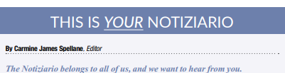 We encourage you to submit articles for the newsletter to tell your story. It could be about a recent trip to Italy, honors received by you or your family, milestones such as significant birthdays or anniversaries, reviews of books on Italian topics, or recipes, to name but a few ideas.