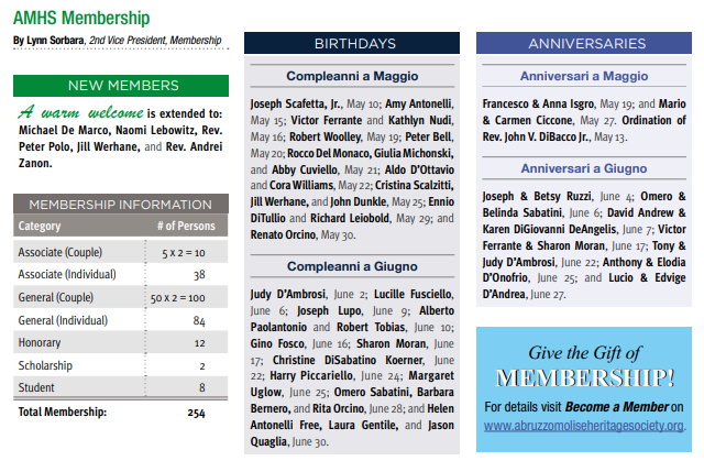 All articles can be emailed to abruzzomoliseheritagesociety@gmail.com to my attention. As editor, I will carefully review each submission and edit as needed. Please understand that publication of any article is subject to space available and the appropriate nature of the content, but we will make every effort to use your work and photos.