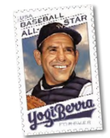A smiling Yogi is shown wearing a New York Yankees baseball cap and a catcher’s chest protector. A partial view of a catcher’s mitt is also seen. The first day of issue ceremony took place in the Yogi Berra Museum & Learning Center on the grounds of Montclair State University in Little Falls, New Jersey, on June 24, 2021. The stamp image of Yogi is based upon a portrait painted by artist, Charles Chaisson, from a photo taken by the Associated Press. The sheets will be available for purchase for $11 each at all local post offices until June 23, 2022. Yogi Berra served in World War II as a gunner on a rocket-launching ship during the D-Day invasion of Normandy, France. He made his major league debut in 1946.