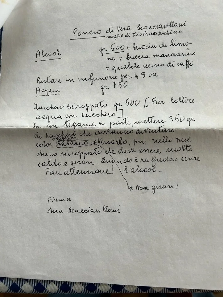 “My grandparents (Vincenzo Palumbo and Anna Scacciavillani) emigrated from Frosolone in Campobasso in 1903-5(?). I visited Frosolone in the late ’90s. My great-aunt, Vera Scaccivillani (about 85 yrs. old at the time) wrote out her recipe for the liquore, Poncio, for me. (She served it to me, and I loved it sooo much!) I have resurrected the copy but I’m having trouble reading her handwriting and translating it. Perhaps some of your members may be able to help. For the historical aspect, I’m most interested in a direct transcription, as much as possible (rather than an interpretation of what she may have meant)… as well as the interpretation of ambiguous aspects!)