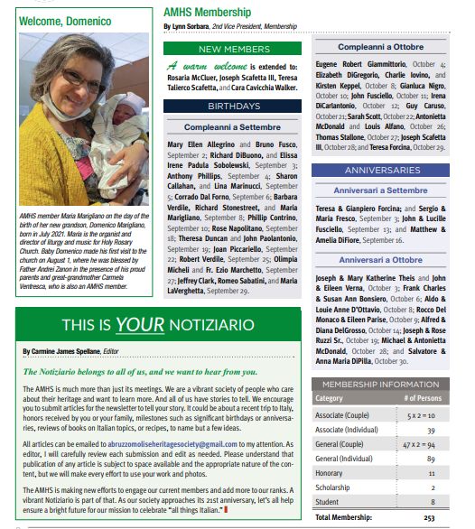 On June 27, AM HS President Emeritus Lucio D’Andrea, and his wife Edvige, celebrated 62 years of wedded bliss. They day started with the 10 a.m. Mass at Holy Rosary Church, where Father Andrei Zanon called them to the altar, before the end of Mass, to bestow a blessing. All in attendance cheered for this wonderful milestone. Afterwards, Lucio and Edvige were taken out for a dinner celebration at A Modo Mio (formerly Joe’s Place) on Lee Highway in Arlington, Va. Lucio and Edvige were joined by their daughter Maria, their grandson Tyler, and AMHS members Luciana Caleb and Albert Paolantonio. Buona fortuna, Lucio and Edvige. Here’s to many more years of wedded happiness. ❚