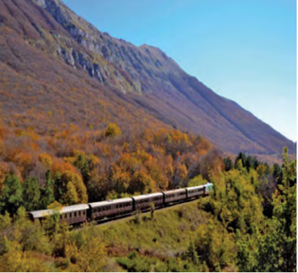 In April of 2021, Italy ’s Cultural Minister announced a 435-million-euro investment in the countr y ’s historic railway lines, notable pilgrimage routes, and other cultural itineraries. Two of note are the Ferrovia dei Templi that runs bet ween A grigento and Por t Empedocle in Sicily. The other is the Transiberiana d’Italia, or the Railway of the Parks. It is called Transiberiana d’Italia because it crosses the Apennines and at one of its stops reaches an altitude of 1268.82 meters with the snow y, ic y landscape reminiscent of Siberia. It travels through the forests of the Majella National Park and the mountainous areas of the Abruzzo and Molise regions. The trains are equipped with bic ycle storage compar tments and many train itineraries include tour, trekking and culinar y guides.