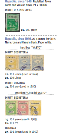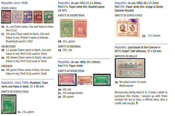 Vasto is the home town of my maternal ancestors. Located on the Adriatic Sea in the Province of Chieti, in the Abruzzo region, it has a population of about 41,000 people. Vastese municipals are difficult to acquire. In the listing which follows, stamps in my collection are listed in normal type. Others known to me are listed in italics. “In use” dates are from cancellations or copies on documents. This is the most complete listing of Vastese municipals to date.