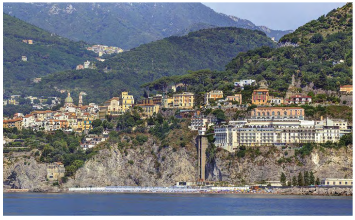 Hotel Lloyd’s Baia (right foreground) in Vietri sul Mare is carved into a cliff overlooking the Gulf of Salerno