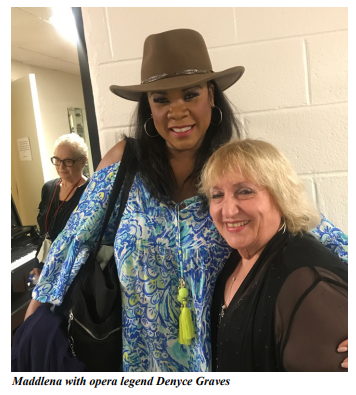 Meanwhile, as its last opera of this season, WNO presented Candide, Voltaire’s work put into music by Leonard Bernstein and starring opera legend Denyce Graves. After the final performance, Maddalena said she had the honor of seeing her backstage. Maddalena calls Denyce Graves ”one of the best sopranos in modern America” and noted that she became world famous in the 1990s for her role as Carmen at the Met in New York as well as for her role in Samson et Delila. Maddalena calls Denyce Graves “a beautiful person, inside and out” and a friend of the opera.