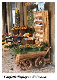 We went on to Lago di Barrea, a lake created by the damming of the Sangro River, having a unique aspect of the smaller and shallower section of the lake appearing green and the larger and deeper looking green. Much to our good fortune, we found lodging in the family run Hotel Lago Verde, right on the edge of the lake and at the foot of the town. We were just in time for pranzo in the hotel’s restaurant, where over the course of the next few days, we enjoyed a number of local, home cooked specialties, including the pasta fusillone and scamorza al forno (baked cheese) and homemade breakfast treats. Our hosts Confetti display in Sulmona 9 Carmelo, his wife, Wilma, their daughter, Adele, and son, Antonio could not have been nicer or more helpful. They recommended a hike around part of the lake, where the wildflowers were in abundance and where we met Wilma and Adele taking their own advice. Joe also encountered another local, also named Giuseppe, with whom Joe shared his appreciation of the beauty of the lake and surroundings. As promised, there was a little snack bar half way through our trek where we ordered a drink and pizza, and the hostess kindly treated us to homemade, still warm pastry tarts. We climbed the steep hill to the charming town, topped by the castello with spectacular views, and meandered through the crooked streets, stopping to appreciate and photograph some of the lovely spots. In fact, we found out later that we took a picture of the flower festooned house right next door to the home of AMHS member Stephen DiGirolamo! Before leaving the area, we explored another interesting town in the area, Rivisondoli, best known as a ski resort but also a pleasant place to visit in the summer, with views of the mountains and a number of pretty churches. By this time in the trip, my motto had become, “There’s always another church to see and admire!” Closer to familiar ground, we checked into the Castel di Septe Hotel, a restored castle surrounded by the countryside of Montepulciano d’Abruzzo vineyards and olive groves, just outside the town of Mozzagrogna. Close to Lanciano, this fairy tale like refuge, with lovely gardens complete with swans gliding in a pond, served as a good base from which to visit that city. In walking around the area near the castello, Joe stopped to chat with some local farmers, who had something to say about the restoration of the castle. Apparently, the owner added a prohibited third floor to the building; despite this violation, he suffered no consequences and was allowed to continue construction! In typical Italian fashion, he took a chance and got away with it, much to the disgust of the locals. They were also unhappy with the increased traffic and the loud music that came from various festivities held at the site. On the other hand, the hotel and conference space provided space for local businesses and industries, many of which have international connections, to host expos and meetings for clients and colleagues. During our stay, the Castel di Septe was the setting for a wedding reception and for a First Communion party, and we witnessed the wedding photographer taking pictures of the newlyweds with a drone as they kissed atop one of the turrets. The hotel restaurant was being utilized for the receptions, so we went into Mozzagrogna for pranzo that day. We enjoyed another typical local meal, this time including raffiche, a pasta similar to cavatelli, but without the ridges. There were few others in the restaurant; several tables were watching the World Cup soccer game, and another was commemorating the birthday of the family matriarch. As Joe and I finished our meal, the tifosi had left; only we and the celebrating family remained. When the waiter arrived to serve birthday cake and spumante, he led a rousing rendition of “Tanti Auguri!” Of course, we joined in. I witnessed a woman, most likely the daughter of the birthday celebrant, whisper something to the waiter. He then served us cake and bubbly, as well, and the family came to our table to talk to us! Where else but in Italy— or, more specifically, in Abruzzo--would this happen? The people truly live up to their motto, “forte e gentile.” The next day, we toured Lanciano, another marvel of wellpreserved churches and old buildings, including the Basilica della Madonna del Ponte and the pilgrimage Church of the Eucharistic Miracle. As we walked through the streets, some of which followed the cammino of the Apostle Thomas, we could smell the tantalizing aromas of the mid-day dinner being prepared in the kitchens of Lanciano. That made us very hungry, but where to eat? Asking hoteliers, merchants or citizens encountered on the street for their advice about places to dine served us well throughout the trip. In fact, the recommendation by a local of Ai Vecchi Sapori (“old flavors”), a restaurant known for its “cucina tipica,” was a great one. Pranzo was one of the highlights of our day: the food was fantastic, from the cannolo con asparagi to the coniglio in umido to the maiale in crosta con frutta di bosco. The meal was unhurried and relaxing, served in a cool, outdoor space, a treat after a long morning of sightseeing. My mouth waters now just thinking about it!
