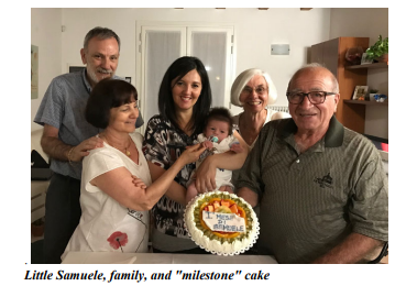 Ah, the wonders of Italy: delicious food, unique wines and spirits, incomparable culture, breathtaking natural beauty, a lovely climate, and the warm citizenry. This past summer, Joe and I took a trip to Italy that allowed us to experience these wonders in abundance. The highlight of our vacation was a reunion with our daughters and their families in Joe’s hometown, Montazzoli, Provincia di Chieti, Abruzzo. Before and after this special time, though, we visited a number of other places around the boot, many of which we had never traveled to before: Chioggia, the “little Venice;” Trieste, where coffee is king; Ferrara, with the impressive Este Castle; Ravenna and its sparkling mosaics; the newly opened FICO Eataly theme park in Bologna; Gubbio, truly “la citta del silenzio;” Assisi, home to Saint Francis and pilgrimage destination to countless faithful; Spoleto, the current setting of the RAI TV series “Don Matteo” (formerly filmed in Gubbio) and seat of the arts Festival dei Due Mondi which began shortly after our departure; Belluno, gateway to the Dolomites; Lucca, the walled Tuscan city that gave the composer Puccini to the world. We flew round trip to and from Venice, so that we could spend time with my Zia Emma, my mother’s older sister, soon to turn 8 99! She lives with her daughter, my cousin Anna, in Spinea, just outside Venice. While we visited, we were fortunate to celebrate the completion of one month in the life of Samuele, Anna’s first grandchild, and Zia Emma’s first great grandchild.