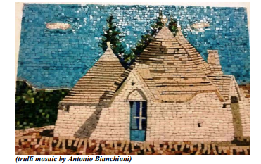 Then Antonio showed his mosaic of the famous trulli of Alberobello. He brought his tools to better explain to the audience how he made this beautiful mosaic through a painstaking process over a period of 45 hours. To learn more about Antonio’s work, we invite you to come to our July 27 program at Casa Italiana (see related article in this issue). Hopefully the audience was left with an appreciation of - and desire to go to - this wonderful region which does not see that many visitors.