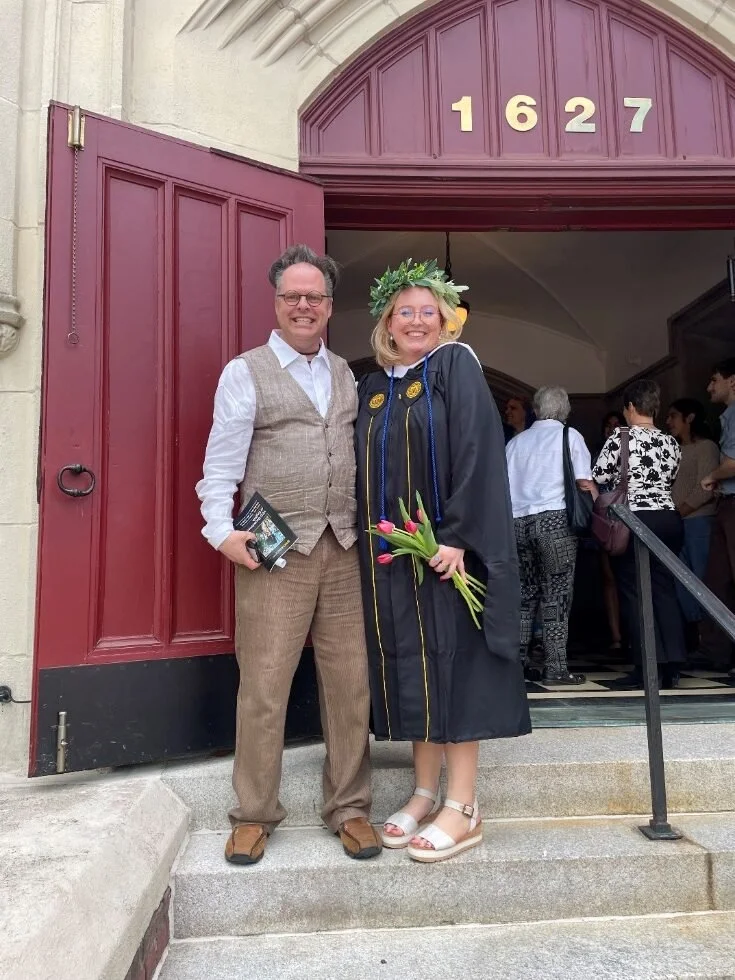 Kathryn Donati on the steps of Grace Covenant Presbyterian Church in Richmond, Virginia, wearing her Italian graduation laurel wreath for her graduation from VCU with her MA.
